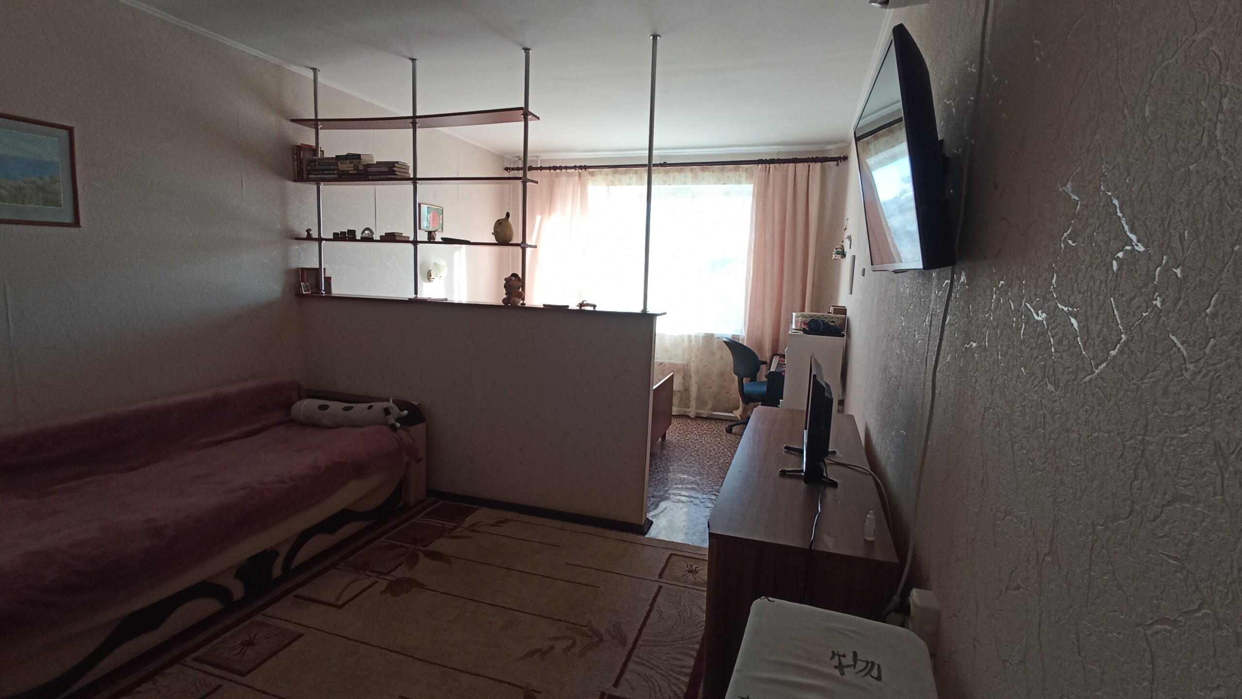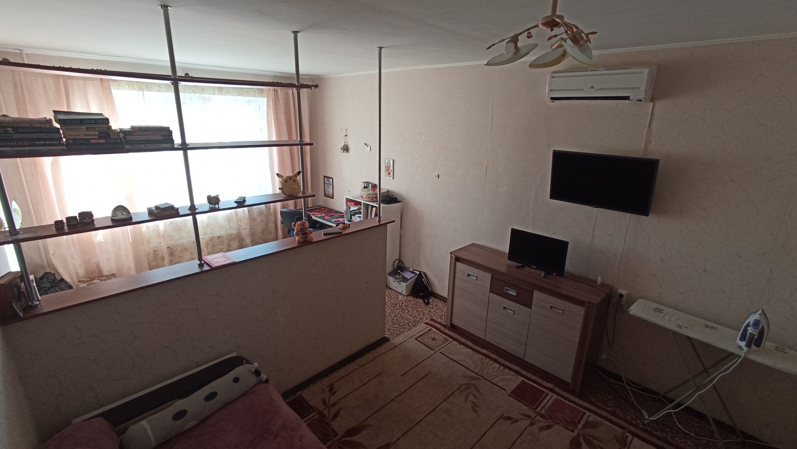 Светлая уютная квартира. Большая жилая комната. Разделена низкой перегородкой на две условные зоны.